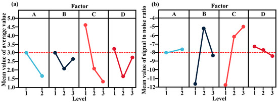 Concurrently, as depicted in Figure 1b, substantial S/N differences were observed for factors B and C, while the variations for factors A and D appeared relatively consistent. Generally, a higher S/N ratio represents a factor of greater significance. The optimal combination was determined to be A2B2C3D2. This translates to torrefaction at 330 °C, combustion at 700 °C, boiling water decontamination, and microwave drying. The red dotted line in the Figure 1 only represents the middle line of the ordinate and has no other meaning. Evidently, the only variation between the optimal combinations derived from the extreme difference analysis and the direct observation was in the level of factor B. The extreme difference analysis was B2 (700 °C), while the direct observation indicated B1 (600 °C). Variations in the initial furnace temperature and the surface humidity of both the tank and the ball during the ball milling test might have contributed to the above results when the sample was introduced to the muffle furnace.