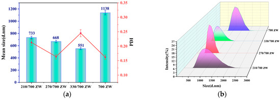 The PDI values of SiO2 particles obtained after torrefaction at various temperatures range between 0.15 and 0.25. This indicates that the dispersion of RHA-SiO2 particles is more favorable at a combustion temperature of 700 °C. The control group exhibited the lowest PDI value (700 ZW), while the high-temperature torrefaction group with 330/700 ZW showed the highest PDI value, suggesting that the high-temperature torrefaction treatment had minimal impact on the dispersion of RHA-SiO2 particles.