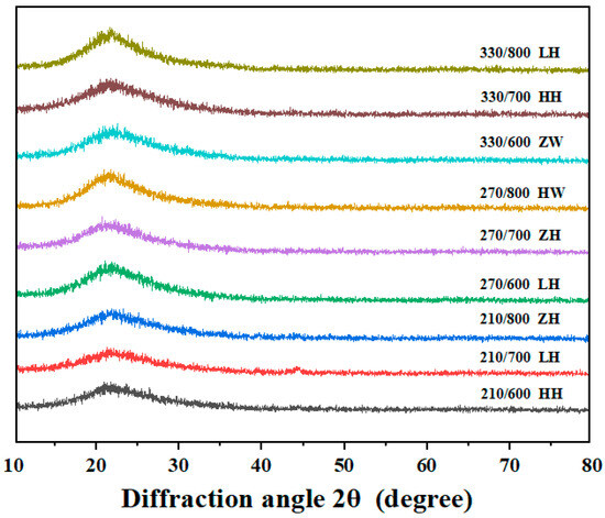Figure 2b shows typical RHA particle size distribution patterns acquired in RH us-ing various treatment procedures. The curve illustrates that different treatment procedures have distinct peak heights and peak widths. The peak of the 210/600 HH group was the most important, with the smallest peak width. The peak width was greatest in the 330/800 LH group. These findings indicate that the particle size distribution of group 210/600 HH is densely packed and has a low dispersion. The distribution of the 330/800 LH group, on the other hand, is more spread out, which is consistent with the PDI extremes in Figure 2a.