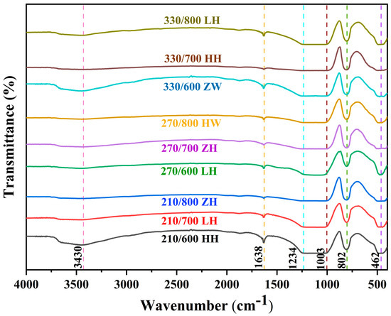 The combined Fourier-transform infrared spectrum (FTIR) is shown in Figure 6. The broadband around 2500–3600 cm−1 was attributed to O–H stretching in RH-based silica, which confirms the presence of hydroxyl group at the silica nanoparticles’ surface and the water absorption in samples [41,42]. The FTIR spectra of RH-based silica samples treated in different ways showed continuous absorption peaks at 1003, 802, and 462 cm−1 [39,43]. In brief, the vibration signal at 1003 cm−1 was the asymmetric stretching of Si–O–Si. The peaks at 802 cm-1 and 462 cm−1 represented the symmetric stretching and asymmetric bending of the Si-O-Si bond, respectively [43,44]. These Si–O–Si stretching and bending phenomena were confirmed silica characteristics. Moreover, the peak at 1638 cm−1 was the H-O-H bending vibration peak of water.