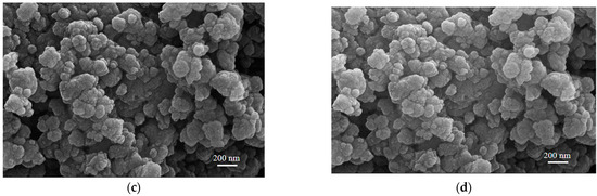 Figure 7 depicts the morphological variations in RHA samples from two different treatment methods: 210/600 HH and 330/600 ZW. The choice of these treatment methods, with a significant difference in their D50 values, facilitates a clearer comparison of particle sizes. The magnified morphology of RHA particles (Figure 7c,d) shows the agglomerates of SiO2 nanoparticles [45]. Moreover, the SiO2 agglomerates in the 330/600 ZW treatment method (Figure 7b) manifest a less dense configuration and feature relatively smaller particle sizes. Such observations might be attributed to the RH undergoing an early transition to the slow combustion phase at a low temperature due to the elevated roasting temperature used. Additionally, microwave drying, with its demonstrated efficiency of being over 30 times faster than traditional drying methods, aids in biomass surface disruption and enhances volatility, while reducing crystallinity [46]. This quickened drying method, in turn, results in a decrease in the oxygen concentration of RH, accelerates cellulose carbonization, and induces partial lignin degradation. Collectively, these modifications contribute to the improved grindability of RHA.