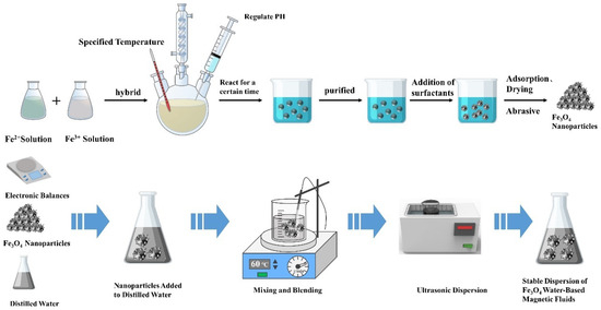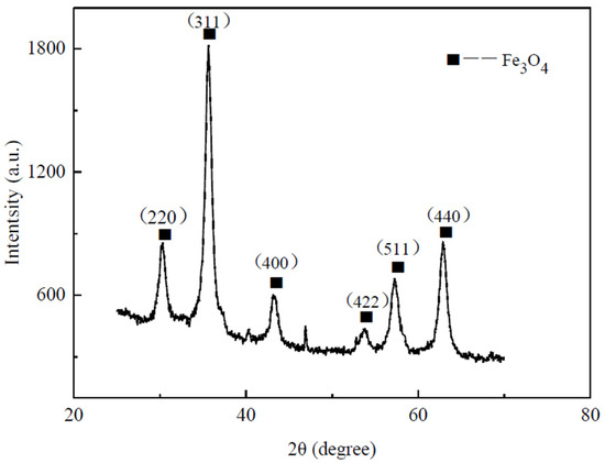 The water–Fe3O4 magnetic fluid investigated in this study was synthesized via chemical coprecipitation by our group. The process of preparing water-based magnetic fluid is presented in Figure 1. A precise amount of FeCl2–4H2O and FeCl3–6H2O were weighed in a 1:2 ratio, mixed together, and dissolved in deionized water. The solution was then transferred to a three-necked flask, which was heated to 70 °C using a thermostatic water bath and stirred using an electric stirrer at 300 rpm. The solution was kept constantly stirred at 300 rpm and heated at 70 °C using a thermostatic water bath. We then added an appropriate amount of NH3–H2O or NaOH solution to the salt mixture under continuous stirring for 30 min. This resulted in the creation of a black precipitate. Oleic acid was added to the solution as a surfactant and the reaction was allowed to proceed for an hour. Upon completion, the heating and stirring were halted, and the resulting black mixture was transferred to a beaker. The beaker was then cooled and washed repeatedly with deionized water. The solid particles were washed, settled in a magnetic field, and subsequently dried in a vacuum oven. Finally, the particles were ground to produce Fe3O4 magnetic particles coated with a surfactant. The Fe3O4 magnetic nanoparticles coated with surfactant were homogeneously blended with the carrier liquid. The magnetic particles were evenly dissolved in the carrier liquid through ultrasonication and dispersion (or high-energy ball milling). The use of ultrasonic dispersion (or high-energy ball milling) ensured even dissolution of magnetic particles in the carrier liquid, thus generating a stable magnetic fluid. The Fe3O4 magnetic particles were analyzed using a Bruker D8-Advance X-ray diffractometer (XRD), and their XRD pattern is presented in Figure 2. Comparison with the standard PDF card revealed that Fe3O4 was the principal constituent of the product.