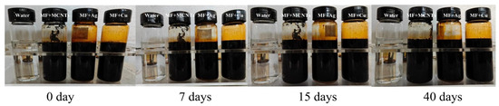 The prepared magnetic fluid was loaded with different types of nanoparticles, such as MCNTs and Cu and Ag nanoparticles. Pristine multi-walled carbon nanotubes (MCNTs) and copper (Cu) and silver (Ag) nanoparticles produced by chemical vapor deposition were purchased from Beijing Zhongkeleiming Daojin Technology Co., Ltd. (Beijing, China). The primary traits of the nanoparticles are illustrated in Table 2, furnished by the suppliers of said nanoparticles. As shown in Figure 4, the hybrid magnetic fluids after being subjected to ultrasonic dispersion showed good stability. The weight fraction in this article denotes the proportion by weight of the nanoparticles in relation to the total weight of both the magnetic fluid and the nanoparticles. More details of the finished samples are shown in Table 3.