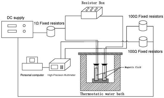 The thermal conductivity of the water–Fe3O4 magnetic fluid was measured using a transient hot-wire technique. An experimental setup, depicted schematically in Figure 5, was developed for this purpose. The setup consisted of a hot wire, a magnetic fluid container, a power source, a Wheatstone’s bridge, a data acquisition system, and a constant-temperature bath. A platinum wire with a length of 0.65 cm and a diameter of 0.2 mm, insulated with Teflon, served as the hot wire.
