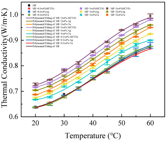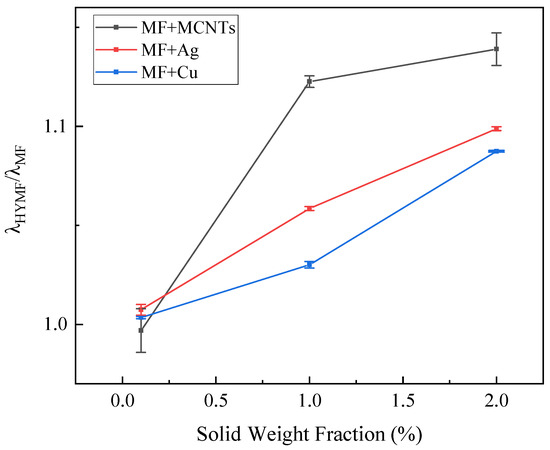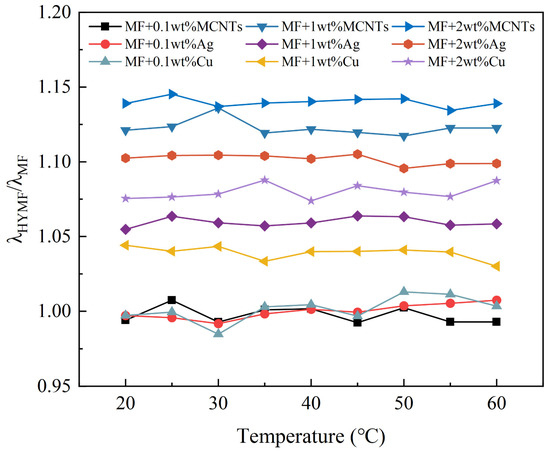 As demonstrated in Figure 7, Figure 8, Figure 9 and Figure 10, the thermal conductivity of the hybrid magnetic fluids significantly increased at concentrations of 1 wt% and 2 wt% when compared to the base fluid. This enhancement can be credited to the notable thermal conductivity of MCNTs and Ag and Cu nanoparticles. These findings suggest that the hybrid magnetic fluids display better thermal conductivity than their single magnetic counterpart. And this aligns with the findings of Sundaret et al. [20]. Figure 10 illustrates an improvement in measured thermal conductivity, suggesting that loading high-thermal-conductivity nanoparticles boosts the thermal conductivity of magnetic fluids, maintaining a constant concentration. Out of the three hybrid magnetic fluids (MF+MCNTs, MF+Ag, and MF+Cu), MF+MCNTs shows the highest thermal conductivity under the same conditions. At a mass fraction of 2 wt%, the thermal conductivity of MF + 2 wt% MCNTs is improved by up to 12%. The corresponding enhancements for MF + 2 wt% Ag and MF + 2 wt% Cu are 10% and 9%, respectively. However, MF + 0.1 wt% MCNTs has a lower thermal conductivity value compared to the base fluid and this difference is due to measurement error. A concentration of 0.1% MCNTs should closely correspond to the thermal conductivity of the base fluid, so the thermal conductivity ratio should be close to 1. With the addition of the error bars to the graphs, the experimental results can be more accurately reflected.