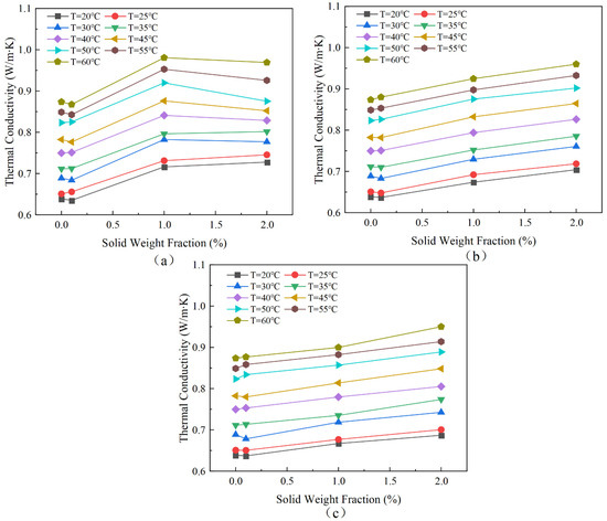To ensure the validity of the setup’s performance, the thermal conductivity of pure water was measured at different temperatures and compared with reliable data [25]. As shown in Figure 6, the measured values demonstrate good agreement with standard values, deviating by no more than 5%. A polynomial fit was performed on the measurements and the goodness of fit was R2 = 0.98. Similarly, a polynomial fit was made to the standard value of distilled water and the goodness of fit R2 = 0.99. The standard deviation of the results of the three repetitions of the test was calculated and solved to obtain the error bars, which are plotted in Figure 6.