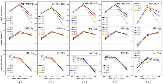 Assuming an acceptable deviation range of 10%, Figure 11a–c shows that the thermal conductivity values based on the EMT equation deviate within this range at mass fractions of 0.1% and 1%. However, the calculated values for MF + 2 wt% MCNTs and MF + 2 wt% Cu are significantly overestimated, particularly for MMCNTs due to their relatively high thermal conductivity, resulting in a maximum deviation of 17% with increasing concentration. In contrast, the theoretical calculation model accurately reflects the experimental values for MF + 0.1 wt% MCNTs and MF + 0.1 wt% Ag, with a minimum deviation of −0.2%. A comparison of calculated values for the three types of nanoparticles shows that the deviation range for MF+Ag remains within 10% at different concentrations and temperatures, accurately reflecting experimental values. One limitation of the EMT-based theoretical model is its inability to predict changes in thermal conductivity with temperature, with no significant changes observed for the three types of nanoparticles added at the same concentration for different temperatures. Figure 11d shows the deviation range between the Y&C theoretical model, which considers nanolayer structures, and experimental values, with a similar overall change range to those of the first three EMT-based models. The Y&C model is a modification of the Maxwell model, but its predictive power is limited by the empirical estimation of nanolayer thickness and thermal conductivity. In this study, we assumed that nanolayer thermal conductivity is equal to particle thermal conductivity (i.e., γ = 1, reducing to λnpe = λnp) and β = 0.1, which could account for the higher bias and should be carefully considered when using correlation.