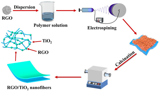 The TL-BM 300 electrostatic spinning machine was used to spin the above-mentioned prepared precursor solutions. The specific spinning process parameters were set as follows: the working voltage was 15 kV, while the feeding speed was kept at 1.5 mL/h; the distance between the spinning nozzle and the receiving drum was 15 cm, the spinning temperature environment was controlled at 25 ± 2 °C, and the relative humidity was controlled at 45 ± 2%. After the spinning process, the precursor nanofibrous membranes were placed in a vacuum drying oven and dried at 50 °C for 6 h to remove the residual solvent. Finally, the RGO/TiO2 membrane was transferred to a tube furnace for calcination at a rate of 5 °C/min to 550 °C and maintained for 1 h to remove the polymer template. For comparative studies, pure TiO2 fiber membranes were prepared using the same method described above, and the detailed pathway of RGO/TiO2 membranes was shown in Figure 1.