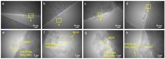 To further investigate the microstructure of the nanofiber membrane, the samples were observed through TEM and HRTEM. After RGO doping, as shown in Figure 4a,e, the 1-RGO/TiO2 nanofibers consisted of many small anatase TiO2 grains and RGO, and the RGO nanoparticles were tightly and firmly adhered to the smooth fiber surface, which was consistent with the results of previous SEM and XRD analysis. As depicted in Figure 4b,f, RGO was tightly adhered between the TiO2 fibers and firmly adhered to the TiO2 nanofibers, forming heterojunctions with the TiO2 nanoparticles [30]. With the increase in RGO doping, the TiO2 nanoparticles were tightly encapsulated by the RGO nanosheet layer, and the contact interface between RGO and TiO2 nanofibers acted as a lattice excess, forming many miniature p-n heterojunctions (Figure 4c,g) [31]. Furthermore, the observed lattice stripes in both 3-RGO/TiO2 and 4-RGO/TiO2 fibers demonstrated the well-defined crystallinity of the fibrous membranes, where the lattice stripe spacing of 0.35 nm was in accordance with the (101) crystal plane of TiO2 [32]. Interestingly, with the further increase in doping, 4-RGO/TiO2 grew a two-dimensional lamellar structure on the fibers surface, forming a backbone structure to support the TiO2 nanofibers and increasing the specific surface area of TiO2-based nanofibers during the photocatalytic reaction (Figure 4d,h) [33].