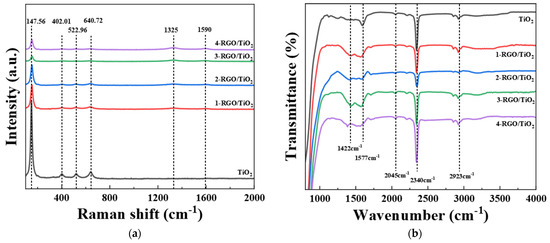 Figure 6. (a): Raman spectra analysis of TiO2, 1-RGO/TiO2, 2-RGO/TiO2, 3-RGO/TiO2, 4-RGO/TiO2 fiber membranes; (b): FTIR spectra analysis of TiO2, 1-RGO/TiO2, 2-RGO/TiO2, 3-RGO/TiO2, and 4-RGO/TiO2 fiber membranes.
