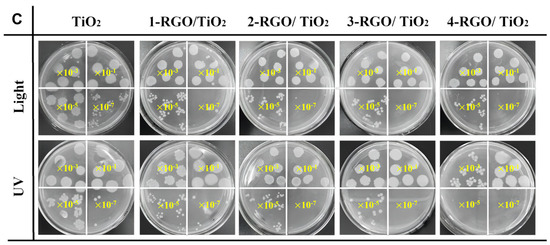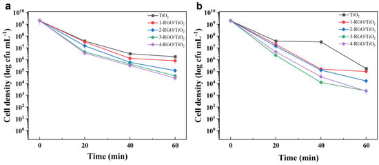 To evaluate the photocatalytic antimicrobial performance of RGO/TiO2 fiber membranes, one of the typical waterborne bacteria, E. coli, was chosen as a model bacterium. In Figure 7a, the TiO2 photocatalyst had a bactericidal effect on E. coli under light conditions due to the generation of reactive hydroxyl groups, such as (·OH, ·O2, H2O2, and h+), on the fiber surface during the photocatalytic reaction of TiO2 fibers that could attack the bacterial cells and cause bacterial inactivation with bactericidal effect [41]. For samples TiO2, 1-RGO/TiO2, 2-RGO/TiO2, 3-RGO/TiO2, and 4-RGO/TiO2 fiber membranes, 3 log, 3.3 log, 4.2 log, 4.7 log, and 4.9 log of E. coli were inactivated after 60 min of visible light irradiation, respectively, indicating their cytotoxic effect on E. coli cells. In Figure 7b, for TiO2 fibrous membranes after 60 min irradiation under visible light conditions, 4 log of E.coli were inactivated. The inactivation rates of 1-RGO/TiO2, 2-RGO/TiO2, 3-RGO/TiO2, and 4-RGO/TiO2 fiber membranes were 4.2 log, 5.1 log, 5.1 log, and 6 log for E.coli under the same conditions, respectively, and the 4-RGO/TiO2 fiber membranes exhibited excellent photocatalytic antibacterial performance.