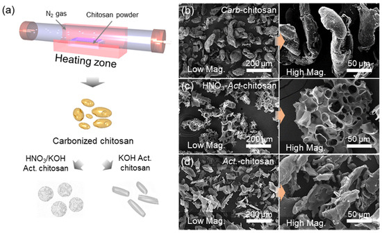 Schematic illustration and characterization of carbonized chitosan (Carb-chitosan) and the activated samples (HNO3-Act-chitosan and Act-chitosan). (a) Experimental steps. SEM images (low magnification [left] and high magnification [right]). (b) Carb-chitosan fabricated at 400 °C. (c) HNO3-Act-chitosan activated at 800 °C after HNO3 treatment. (d) Act-chitosan activated at 800 °C.