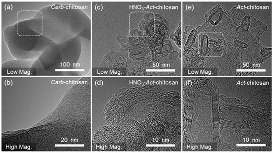 TEM images of Carb-chitosan, HNO3-Act-chitosan, and Act-chitosan. (a,b) Carb-chitosan (c,d) HNO3-Act-chitosan. (e,f) Act-chitosan. Low magnification (top) and high magnification (bottom).