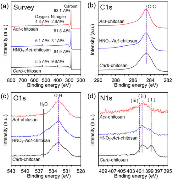 Chemical composition of Carb-chitosan, HNO3-Act-chitosan, and Act-chitosan as measured by XPS. (a) Survey. (b) C1s narrow-scan spectra. (c) O1s narrow-scan spectra. (d) N1s narrow-scan spectra. (i) Pyridine-like peak (–NH2), (ii) Pyrrol-like peak (O=C=NH–), (iii) nitrogen atoms that are either protonated or oxidized.