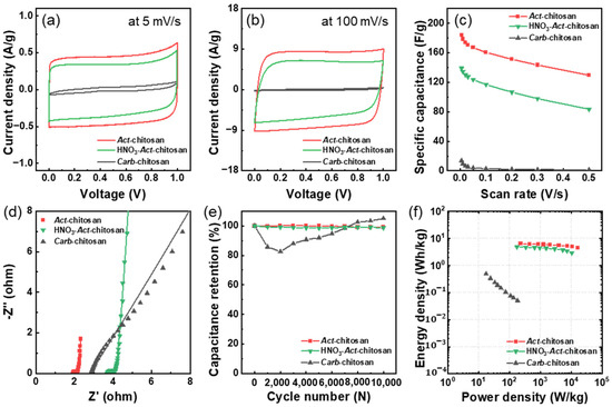 Cyclic voltammetry (CV) curves of Carb-chitosan, HNO3-Act-chitosan, and Act-chitosan at scan rates of (a) 5 mV/s and (b) 100 mV/s. (c) Rate performance of the samples at scan rates of 5–500 mV/s. (d) Nyquist plots of the samples. (e) Capacitance retention of the electrodes during 10,000 cycles. (f) Ragone plots of the specific energy density and power density of the supercapacitor for each electrode.
