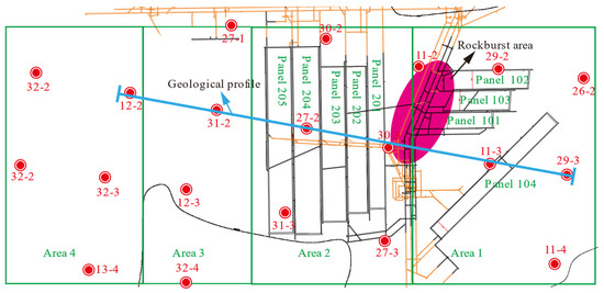 Layout of Gaojipu coal mine. The red-shaded areas underwent several dynamic events during the extraction of the 101–103 panels of Area 1.