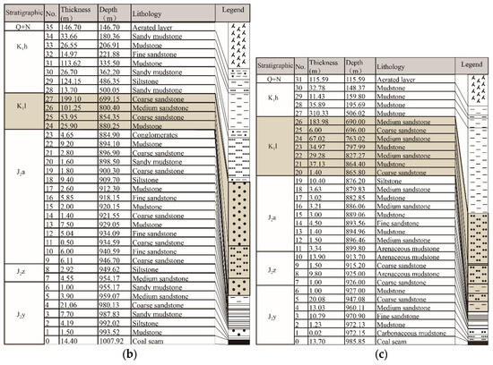 Gaojiapu Mine stratigraphic distribution profile. (a) Geological profile. (b) Borehole 27-2. (c) Borehole 30-3.