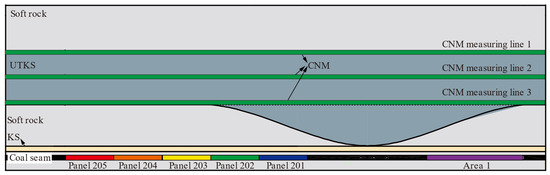 The vertical displacement measured by various measurement lines during the excavation is depicted in Figure 9. The results show that, after the extraction of Areas 1 and 2, the KS1 and the weak strata (reflected by line DML 5–7) sag significantly, whereas the UTKS (reflected by line DML 2–4) undergoes only minor displacement.