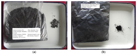 The CNM materials: (a) the chopped carbon fibre sourced from Toray Industries, Inc. (Tokyo, Japan); and (b) the nano-carbon black sourced from Suqian Xigu Nanotechnology Co., Ltd. (Suqian, China).