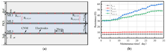 Variation in resistance during the settlement period of the materials. (a) Scheme of CNM laying and measurement. (b) Variation in resistance during the maintenance period of simulation materials.