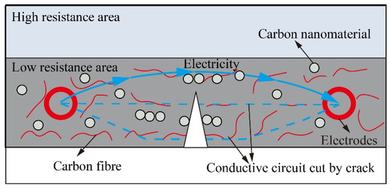 Various studies [25,27] have suggested that the electrical resistance of the CNM changes as the material experiences damage. This correlation leads to the idea of incorporating CNM in the simulated rock layers to measure their electrical resistance changes as a result of excavation. In the physical model, the buried CNM layers would form the primary circuit of conduction [28]. When a crack forms in a layer (as illustrated in Figure 7), the connection between carbon nanomaterials will disengage, and the carbon fibre will fracture. This leads to the conductive circuit being partially or entirely cut off, increasing the resistance of the CNM [29,30]. In other words, increasing resistance reflects certain damage to the material.