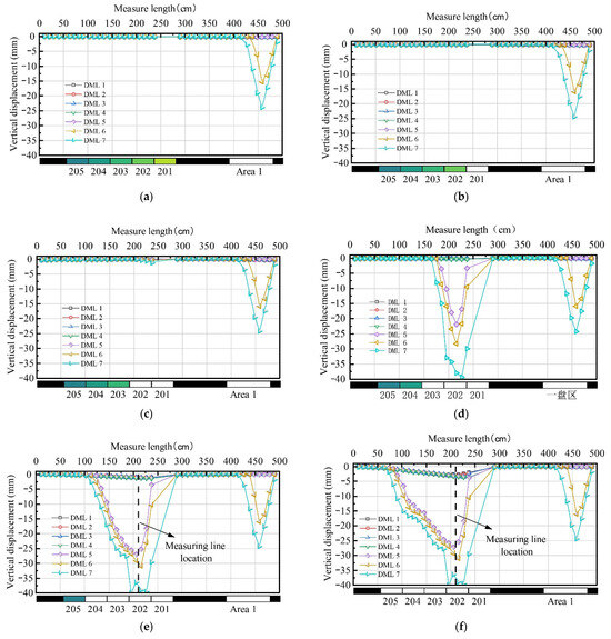 Subsidence of measuring lines after mining of each panel. (a) When the mining of Area 1 ends; (b) when the mining of Panel 201 ends; (c) when the mining of Panel 202 ends; (d) when the mining of Panel 203 ends; (e) when the mining of Panel 204 ends; and (f) when the mining of Panel 205 ends.