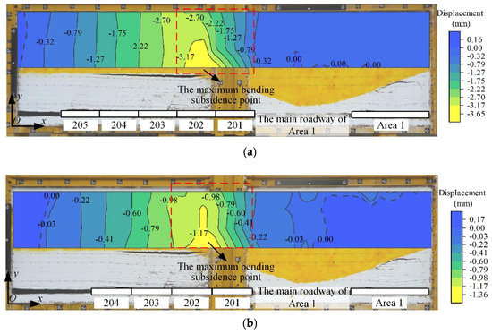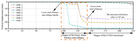 After all panels are excavated (Figure 9f), the maximum displacements on DMLs 5, 6, and 7 are −27.24 mm, −31.05 mm, and −39.99 mm, or 68.10%, 77.7%, and 99.8% of the extraction thickness (40 mm), respectively. In contrast, the maximum subsidence values of DMLs 1, 2, 3, and 4 within and above the UTKS are only −2.86 mm, −3.10 mm, −3.50 mm, and −3.65mm, or 7.2%, 7.8%, 8.8%, and 9.2% of the extraction thickness, respectively. The significant difference in subsidence leads to the large separation beneath the UTKS (up to 23.90 mm) and a small subsidence coefficient on the top of the model (only 0.072 mm).