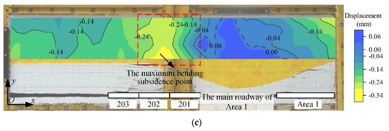 Analysed distribution of displacement in the UTKS during excavation. (a) Displacement distribution in the UTKS after Panel 203 was excavated. (b) Displacement distribution in the UTKS after Panel 204 was excavated. (c) Displacement distribution in the UTKS after Panel 205 was excavated.