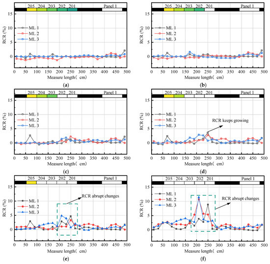 Variations of RCR under different mining conditions. (a) When the mining of Area 1 ends; (b) when the mining of Panel 201 ends; (c) when the mining of Panel 202 ends; (d) when the mining of Panel 203 ends; (e) when the mining of Panel 204 ends; and (f) when the mining of Panel 205 ends.
