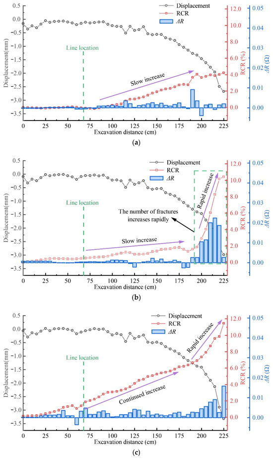 Displacement, RCR, and resistance difference change curves of UTKS during coal seam mining. (a) Variation of RCR of the top interface (ML 1) of the key stratum. (b) Variation of RCR of the middle interface (ML 2) of the key stratum. (c) Variation of RCR of the bottom interface (ML 3) of the key stratum.