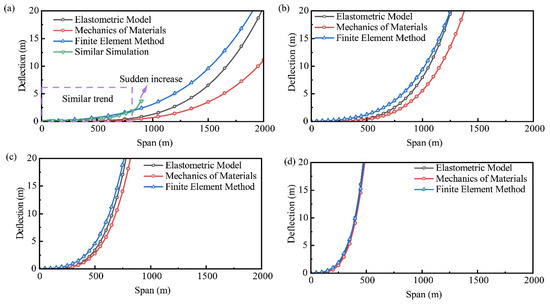 A smaller thickness results in greater deflections at the same span and smaller critical spans, as shown in Figure 14a–d. For instance, when the thickness is 50 m (Figure 14d), the critical span reduces to 200 m only. This result suggests that special attention should be paid to regions where the thickness of the UTKS significantly changes.