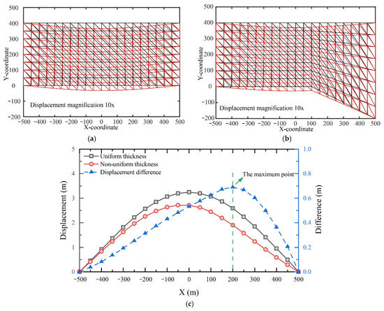 Figure 15c compares the analysed deformation from these two models. The results show that the displacement of the uniform-thickness beam is symmetrical, whereas it is asymmetrical in the varying-thickness beam model. The increase in thickness results in an overall decrease in displacement. Comparing the two displacement curves, the greatest difference in displacement is located approximately 100 m from the thickness-changing point (X = 100 m). The deformation behaviour derived from these thick beam models is consistent with that obtained from the physical model, highlighting that special attention should be paid to regions where the thickness of the UTKS changes.