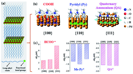 Illustration of the process for synthesizing ultrathin Pd nanosheets with controlled surface facets. (a) A summary of how long-chain alkyl surfactants interact to generate layered mesophases, which in turn promote the growth of Pd nanocrystals. (b) Illustration of surface interactions and (c) corresponding energy differences (ΔEb) of functional head groups on different Pd crystal planes, as computed from basic principles [58]. Open access article.