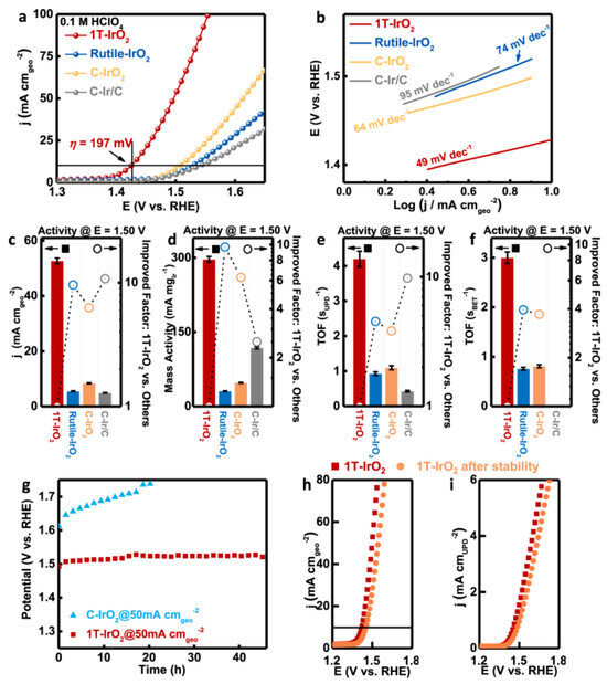 (a) In an O2-saturated 0.1 mM HClO4 electrolyte, polarization curves were produced for 1T-IrO2, Rutile-IrO2, and commercially available catalysts (C-IrO2 and C-Ir/C) after applying iR-correction. 1T-IrO2 demonstrated an overpotential of 197 mV in this situation, which allowed for the production of a current density of 10 mA. (b) Subsequently, Tafel plots were derived from the polarization curve. (c–f) The analysis included a detailed comparison between the reversible hydrogen electrodes (RHEs) across 1T-IrO2, Rutile-IrO2, C-IrO2, and C-Ir/C, as well as geometric activities, mass activities, underpotential deposition (UPD)-based turnover frequency (TOF), and Brunauer–Emmett–Teller (BET)-based TOF values at 1.50 V. (g) Turning to the performance during chronopotentiometry, the behavior of 1T-IrO2 and C-IrO2 was assessed under a sustained high constant current density of 50 mA. Impressively, 1T-IrO2 demonstrated its capacity to uphold a notable level of electrochemical activity throughout. (h) In addition, the assessment included the geometric polarization curves and (i) the UPD-based polarization curves of 1T-IrO2 both before and during a stability test that was carried out under challenging circumstances with a high current density of 50 mA. Notably, the alteration in UPD-based active-area-based activity within 1T-IrO2 was observed to be minimal. The error bars associated with the data represent the means accompanied by the standard deviation, derived from three replicates (n = 3 replicates). Adapted with permission from [76]. Copyright (2021) Nature.