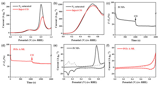 Illustration of the linear sweep voltammetry (LSV) curves of (a) commercial Pt nanoparticle and (b) PtTe A-ML in electrolytes of N2 saturation or CO injection, containing 0.5 M HCOOH and 0.5 M H2SO4, with a scan rate of 50 mV s−1. The response of (c) commercial Pt NPs and (d) PtTe A-ML to CO injection in 0.5 M H2SO4 and 0.5 M HCOOH is depicted during chronoamperometry tests. Furthermore, CO-stripping measurements for (e) commercial Pt NPs and (f) PtTe A-ML are showcased in N2-saturated 0.5 M H2SO4 electrolyte at a scan rate of 50 mV s−1 [91]. Open access article.