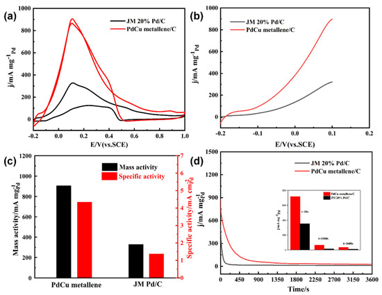 (a) The catalysts’ CV curves were recorded in a solution with N2 saturation that contained 0.5 M H2SO4 and 0.5 M HCOOH. (b) An enlarged picture of the PdCu metallene and JM 20% Pd/C. The catalysts’ particular activity and (c) MA are demonstrated. (d) The PdCu metallene and JM 20% Pd/C CA curves are shown at 0.2 V. The catalysts’ current values are shown in the inset of (d) after 10, 1000, and 3600 s. Adapted with permission from [101]. Copyright 2023 American Chemical Society.