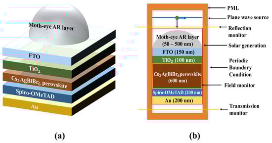 The Cs2AgBiBr6 double perovskite solar cell with a parabola-shaped moth-eye antireflection layer was designed by using the Lumerical 2022 R2.4 FDTD Solution software, including a technology computer-aided design (TCAD) tool, which is able to recognize the multi-coefficient fitting of complex refractive indices of materials, and then, calculates the opto-electronic performance based on the optical properties. Internal quantum efficiency (IQE) was assumed to be 100% during the optical simulation process, allowing the short-circuit current density (JSC) to be predicted at its maximum value [33]. Figure 1 shows the schematic diagram indicating information about the simulation, including the device structure and simulation setup.
