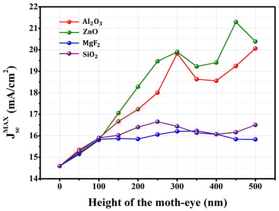 Figure 2 contains plots of the height of the single moth-eye antireflection layer vs. Jsc,max of the designed device under the wavelength of light in the range of 400–900 nm. The value of the reference cell was marked as a moth-eye height value of 0 nm, and the value was calculated to be 14.59 mA/cm2. Until the moth-eye AR layer increased to 100 nm, the short-circuit current density of the solar cells at each of the four conditions showed similar electrical performances. Since the height of the moth-eye antireflection layer was relatively low, optical reflection suppression did not appear to work well under the four conditions when the height was below 100 nm [41]. Focusing on heights over 100 nm, as the height increased, a clear difference in the increase in performance appeared. In the case of low-index conditions, the increase in Jsc,max was slight, and the average performance values according to height were about 15.78 and 16.01 mA/cm2. The optimal conditions for both moth-eye antireflection layers were achieved with heights of 350 nm and 250 nm, resulting in electrical performances of 16.22 mA/cm² and 16.66 mA/cm², respectively. In contrast, under high-index conditions, the performance exhibited a significant improvement, with the extent of enhancement closely tied to the height of the moth-eye antireflection layer. When the height of the moth-eye antireflection layer was 300 nm, the short-circuit current density reached an inflection point at both high-index conditions, and the optimal conditions were when the heights were 450 and 500 nm, and the Jsc,max at that time were 20.06 and 21.3 mA/cm2. The inflection point according to height is considered to be due to the interference effect, which is due to the height of the moth-eye antireflection layer on the device [33,37].