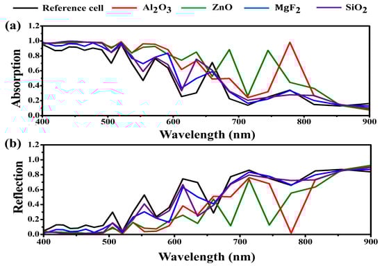 As mentioned above, the optimal heights for Al2O3, MgF2, SiO2, and ZnO are 450, 350, 250, and 500 nm, respectively. Based on these conditions, we calculated their optical performances including absorption and reflection using a frequency-domain field and power monitor type DFT monitor. Since there is a back reflector within the device, we used the formula A(λ) = 1 − R(λ) for calculating the absorption that excludes transmission [42]. We plotted these results in Figure 4.