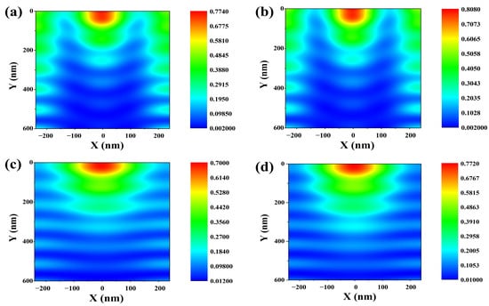 In the case of the reference cell, the charge generation rate shows a flat formation, and no refraction within the absorption layer was observed. In Figure 3a, the maximum charge generation rate was calculated to be 2.7 × 1027 m3/s on top of the absorption layer. By applying the moth-eye AR layer, the charge generation distribution converged within the absorption layer. Unlike the reference cell, the charge generation rate within the absorption layer of the Cs2AgBiBr6 perovskite solar cell was calculated to be approximately 5 × 1027 m3/s or more on top of the absorption layer. Then, the charge was distributed in a refracted form within the absorption layer. The electric-field intensity distribution related to this will be discussed later. These results show the charge distribution pattern of the moth-eye AR layer of Cs2AgBiBr6 perovskite solar cell with moth-eye AR layer for each of the four materials. These results show a more detailed investigation of the electrical properties by showing the charge distribution pattern of the moth-eye AR layer of Cs2AgBiBr6 perovskite solar cell. Table 2 summarizes the results of these electrical performances at the optimal device conditions.