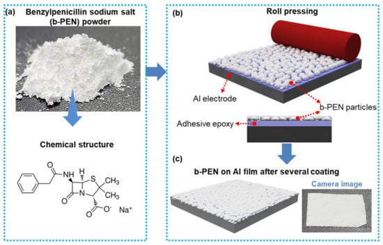 (a) Benzylpenicillin sodium salt (b-PEN) powder and its chemical structure. (b) Process of uniformly coating the surface of the Al electrode with b-PEN. (c) Schematic and camera image of b-PEN coated Al tape as a tribopositive layer.
