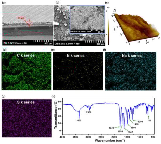 (a) Field−emission scanning electron microscopy (FE−SEM) image of the cross−section of b-PEN tribopositive layer coated on the Al film. (b) Top-view FE−SEM image of b-PEN (scale bar: 300 µm) with inset image at higher magnification (scale bar: 20 µm). (c) 3D AFM nanaoprofile image of the bPEN film. (d–g) Energy−dispersive spectroscopy results for the b-PEN, confirming the presence of C k, N k, Na k, and S k series. (h) Fourier transforms infrared spectrum of b-PEN.
