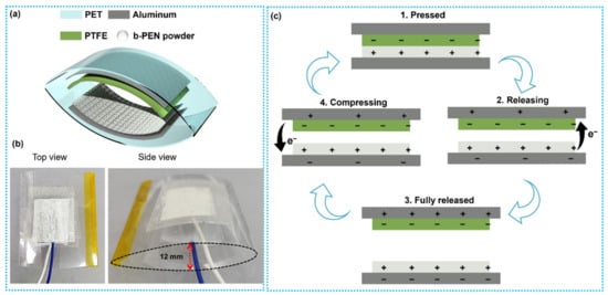 The proposed TENG device was fabricated using b-PEN and PTFE (Sigma Aldrich, Seoul, Republic of Korea) as triboelectric layers in contact–separation mode. The schematic and photo of the fabricated arc-shaped TENG device are shown in Figure 3a,b. In the proposed TENG device, b-PEN acts as a tribopositive layer, while PTFE acts as a tribonegative material. The generated electric potential is collected using an adhesive Al tape as a flexible electrode. A flexible sheet (PET) with an arc-shaped design was used as a supporting substrate for the electrodes. This substrate provided sufficient support for the quick self-recovery of the device to a fully released state in the contact–separation process. The b-PEN powder was uniformly spread on the adhesive surface of the Al tape and pressed to ensure adhesion. At the same time, PTFE was attached to the other Al electrode (adhesive side). Copper wires for external electrical connection were attached to the nonadhesive sides of the Al electrodes. The active surface area of the fabricated TENG device was 2 × 2 cm2, whereas the distance between the two triboelectric layers was ~12 mm at the curvature center of the arc-shaped TENG in the original state, as shown in the side view of Figure 3b.