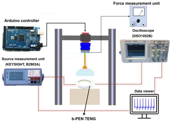 We have measured the electrical performance of the b-PEN TENG device using a standard dynamic push testing benchtop platform as illustrated in Figure 4. The pushing tester device can be operated under different frequencies and forces to test the electrical output of TENGs in contact separation mode. An Arduino controller was utilized to program the operating frequency and normal force applied by the pushing cylinder. The cyclic uniform force was applied to the TENG device using a controllable pneumatic air cylinder (Shinyeong Mechatronics Co. Ltd., C3B16-50, Siheung-si, Gyeonggi-do, Republic of Korea). A force sensor that is connected to the pushing tester and accurately measures the applied pressing force. The acrylic block attached to the cylindrical shaft at the bottom contacts the b-PEN TENG to generate the output signal. Open-circuit voltage was measured using an oscilloscope (Agilent Tech., DSO1052B, Santa Rosa, CA, USA), whereas the current of the b-PEN/PTFE TENG device was obtained using a source measurement unit (KEYSIGHT, B2902A, Santa Rosa, CA, USA). The data obtained from the measurement devices was then plotted using Origin Pro 8.5.1 (Origin Lab Corporation, Northampton, MA, USA).