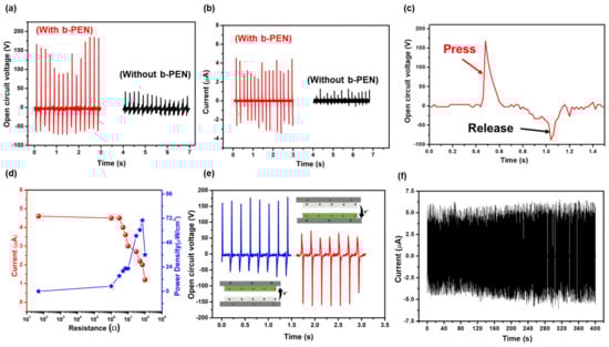 (a) The open−circuit voltage of the proposed TENG device under repeated mechanical force with and without b-PEN (tribopositive layer). (b) Short−circuit current of the proposed TENG with and without b-PEN layer. (c) Zoomed view of the output voltage signal in a single pressing and releasing cycle. (d) Maximum instantaneous power density against resistive load, where the red line with dots indicates the current and the blue line with stars indicates the power density. (e) Phase−change analysis of the proposed b-PEN−based TENG device, the blue line indicates a forward connection while the red line indicates a reverse connection when measuring the voltage signals between the electrodes. (f) The stability test of the b-PEN-based TENG under repeated excitation for 2000 cycles.