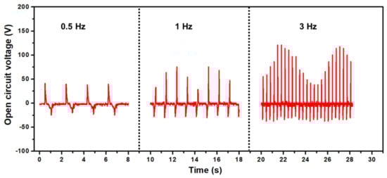 Frequency-dependent electrical performance is of utmost importance in energy harvesting devices depending on the specific applications and conditions. Specifically, low-frequency operatable TENG devices are crucial for efficiently harvesting the energy from the mechanical vibrations or movements that occur at lower frequencies. Human movements such as walking, hand movements, and other subtle movements usually generate lower frequencies, thus TENGs are suitable for wearable devices operating at lower mechanical deformation rates. The frequency-dependent open-circuit voltage performance is evaluated at the same conditions of force (5 N) with 0.5, 1, and 3 Hz frequencies as shown in Figure 6. As shown at 0.5 Hz, the output voltage generated by b-PEN TENG was ~48 V. As the frequency increased from 1 Hz to 3 Hz, the maximum output voltage increased to ~75 and ~101 V, respectively. The triboelectric output performance is highly dependent on the surface charges and tapping speed of the TENG device. The surface charge accumulation and transfer can be enhanced by increasing the pressing and releasing speed of the top and bottom triboelectric layers. With lower frequencies, the pressing speed decreases, resulting in lower surface charges. As the frequency increases, the TENG output reaches a saturation level and starts decreasing at much higher frequencies [64]. This decrease in the output voltage is because limited time is available for the full separation between the top and bottom triboelectric layers of the TENG device during the fast-pressing cycles, thus reducing the separation distance between the top and bottom layers, leading to degradation of voltage at higher frequencies. The proposed b-PEN TENG device shows quite satisfactory output performance at low frequencies from 0.5 Hz up to 5 Hz which can be suitable for mechanical energy harvesting of human motion.