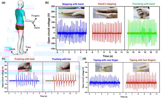 The energy−harvesting capability of the b-PEN TENG device: (a) scheme of energy harvesting from mechanical motions of different body parts, (b) slapping, clapping, and punching with a hand, (c) pushing with a foot (toe, and heel), and (d) fingertip tapping (one finger and two fingers).