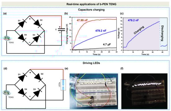 Low-power-operated electronic equipment is often powered by a constant direct-current power source. However, the TENG device generates an alternating current. Therefore, the TENG-generated signals must be rectified using a full wave bridge rectifying circuit, as shown in Figure 8a, to charge the energy-storing device. Figure 8b shows the charging capability of the b-PEN TENG device, applied to different capacitors. The commercially available capacitors with the capacitances of 47.99 nF, 479.2 nF, and 4.7 µF were charged up to the voltages of 22.5, 13, and 2 V, respectively, by repeatedly actuating the TENG device with the pneumatic cylinder for 30 s. Within the same charging time, the 47.99 nF capacitor was the fastest to charge among the utilized capacitors. Similarly, the charge and discharge of the 479.2 nF capacitor with a connected load connected to it are exhibited in Figure 8c. The TENG-powered capacitor is gradually charged up to 15 V for 37 s and quickly discharges when the TENG device stops operating. Hence, the proposed b-PEN TENG demonstrates a good capability to power low-power electronic devices for continuous use. To illustrate the self-powered applications of the b-PEN TENG, 24 commercial LEDs (maximum power dissipation 10 mW and full light illumination current of 20 mA) were connected in series with the b-PEN TENG via a rectifier circuit, as shown in Figure 8d. The TENG device, when actuated using mechanical force, can easily light up 24 LEDs, as shown in Figure 8e,f. The above results indicate that b-PEN (antibiotic) is a promising tribopositive material for triboelectric energy harvesting.
