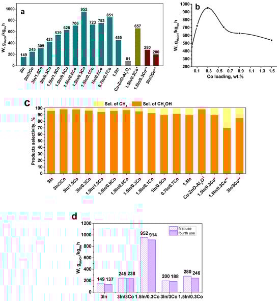 According to Figure 1a, the metal loading had a major impact on the methanol productivity. There was an optimum metal content for both In and Co observed in this work. For the composites without Co, a 1.5% In content in the catalyst was found to be the most active. Thus, the 3In catalyst provided only 149 g MeOH/kg Me·h in comparison with 455 g MeOH/kg Me·h obtained for the 1.5In catalyst. However, the correlation between the metal loading and activity was non-linear, and a further decrease in the In content suppressed the activity. A similar trend was observed for the composites modified with Co. The influence of Co loading was studied with the use of a composite containing 1.5% In (Figure 1b). We found a volcano plot for the activity, with the In/Co ratio of 1.5/0.3% being the most effective. The results were contrary to previously published studies reporting a linear increase in activity with an increase in metal loading for In-based catalysts [11,12]. Our results indicated that there was a balance in the In/Co ratio that enabled the highest activity due to the most efficient utilization of the metals.