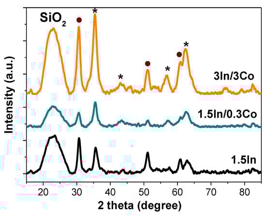 The XRD pattern (Figure 2) revealed the presence of silica at 22° 2θ, a set of characteristic peaks of Fe3O4 (35.4°, 43.08°, 56.9°, 62.6° 2θ), and a set of reflections assigned to In2O3 (30.5°, 51.0°, 60.9° 2θ). Surprisingly, no diffraction peaks associated with Co were observed regardless of the Co loading. This could suggest that the the Co NPs were small and amorphous. The XRD pattern of the composite without PPP contained the similar set of reflections (Figure S3).